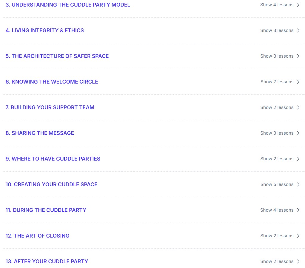 To become a certified Cuddle Party facilitator, you get the benefit of these revised classes with new case study examples from current facilitators and discussion question exercises. We also offer a more interactive Welcome Circle script to enhance the group experience for your participants.